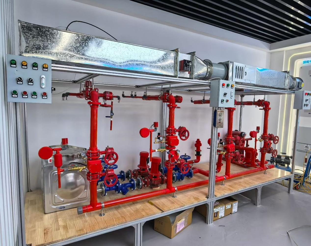 組成:集成在噴淋系模型中,包括高位消防水箱、穩(wěn)壓泵(一主一備)、穩(wěn)壓罐、止回閥、閘閥等。系統(tǒng)概述:安裝在模型上,能清楚的展示增穩(wěn)壓系統(tǒng)的構(gòu)成和工作原理,通過該裝置的操作學(xué)習(xí),學(xué)員可以對自動(dòng)噴水滅火系統(tǒng)的結(jié)構(gòu)有一個(gè)全面的了解。
